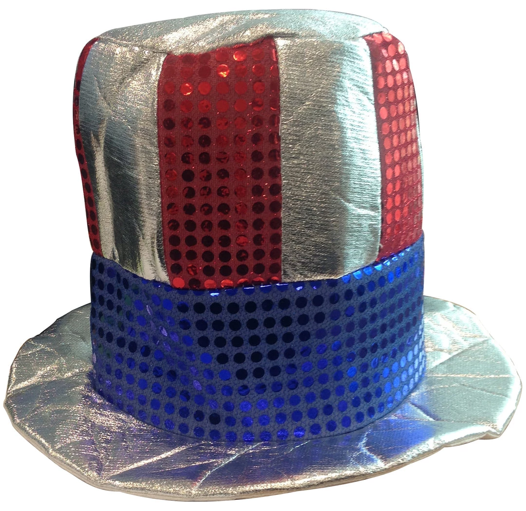 It’s time to show off your American pride and patriotic spirit with these fun and festive red, silver and blue glitz’ n gleam Uncle Sam top hats Each party top hat features silver and red strips that are embellished with sequins of the same color, the brim of the top hat is silver in color. Perfect for Independence Day celebrations and parades, Memorial Day picnics, Labor Day barbecues, or any other special occasion.