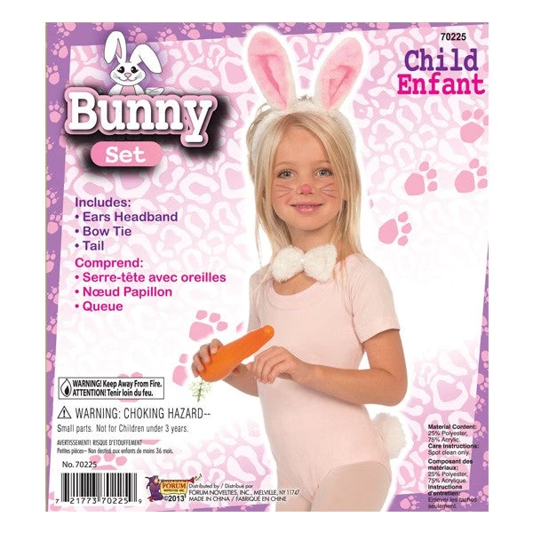 Hop around the neighbor hood with this adorable bunny rabbit costume. This cute and cuddly costume kit features a white headband with attached long bunny ears, and cotton ball tail, and a fuzzy bow tie for a classy look. Meet up with all the bunnies and squirrels in your neighborhood for a fun critter gathering.