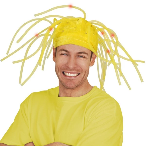 This Light Up Noodle Hat is a great accessory for a number of different events. Great for dressing in your team colours at sporting events! There’s a little pocket inside the hat for the battery pack which, when switched on makes the noodles light up.