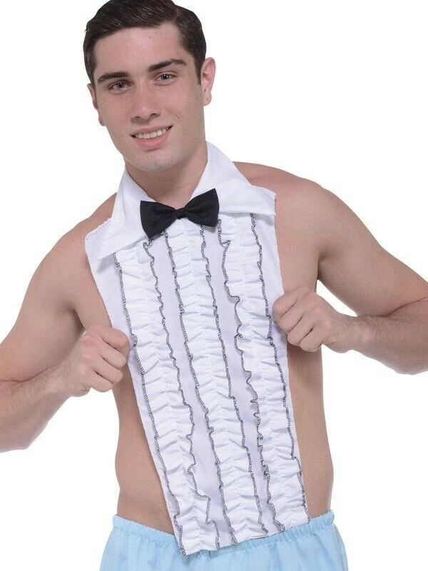 Consists of the ruffles which are attached to a collar and with a black bow-tie.