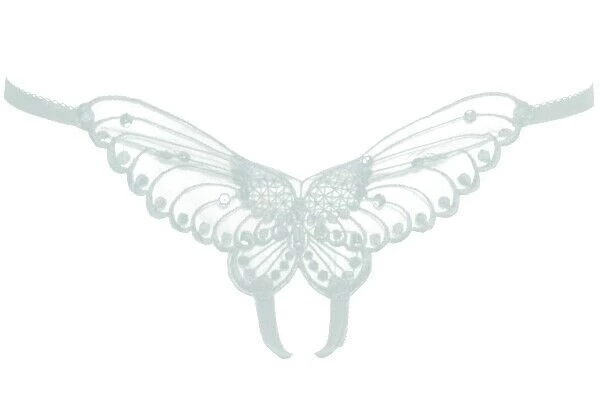 Sheer butterfly appliqued crotchless panty with pearl and sequined details.