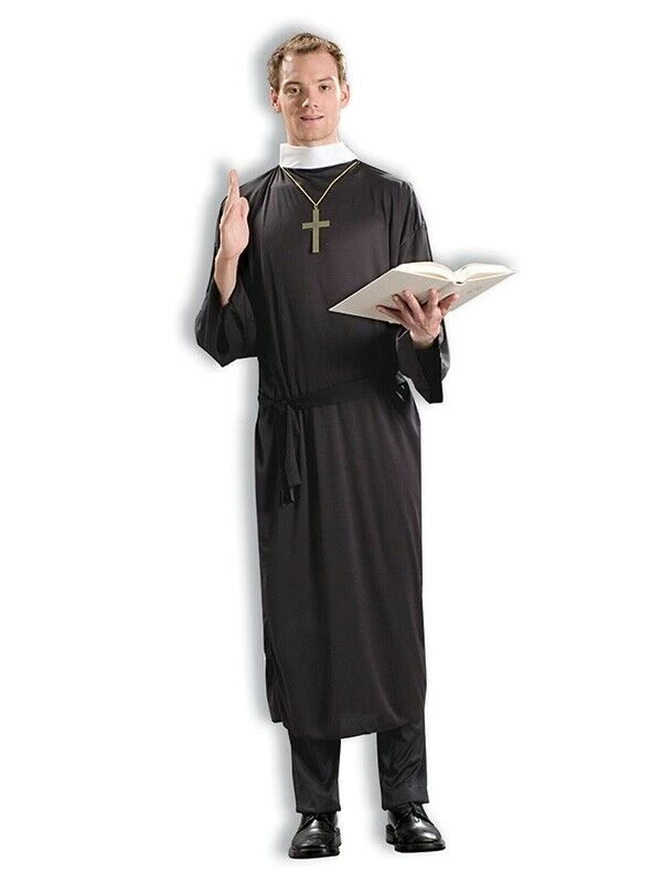 Men’s low quality but affordable plus size priest fancy dress costume. Look the part for the night on a shoe string budget in this cheap men’s religious costume.