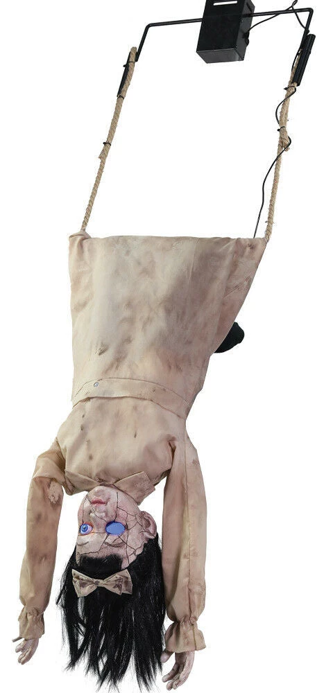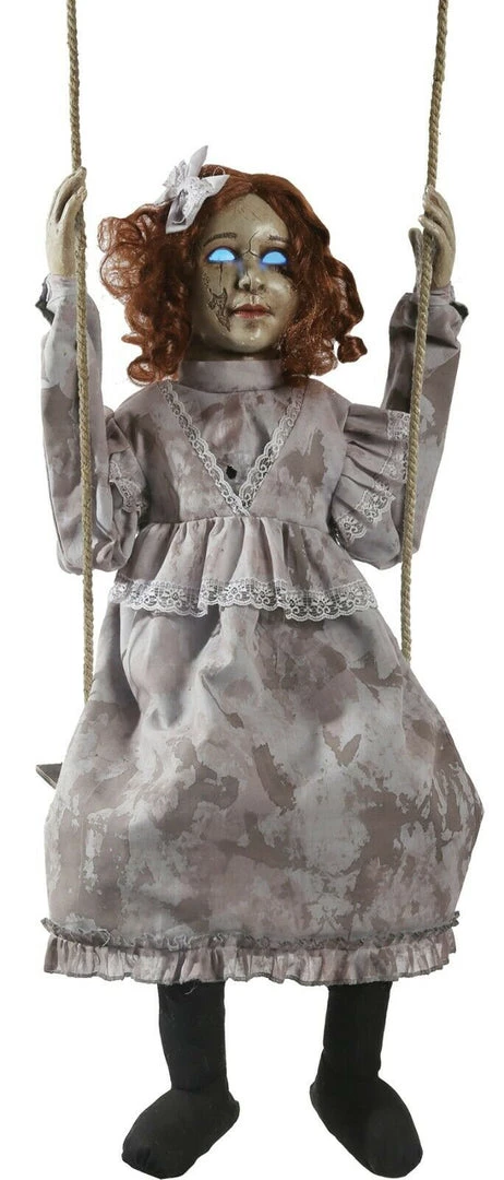 animated prop features a little girl doll hanging by her legs on a swing with