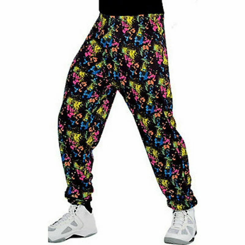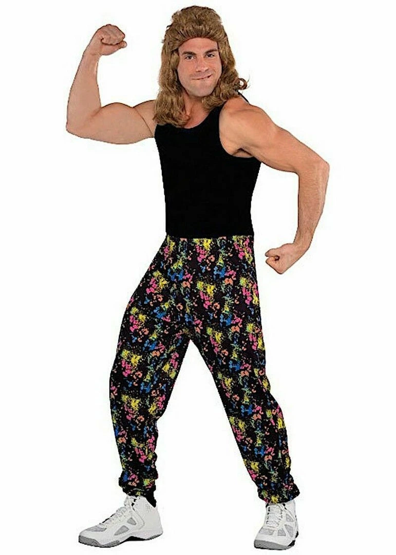 These 80s Muscle Pants are perfect for pumping iron! These black pants feature a roomy, oversized style with a neon paint-splatter print. Wear them to your next 80s-themed party, or use them to create a rad look for your totally 80s costume!